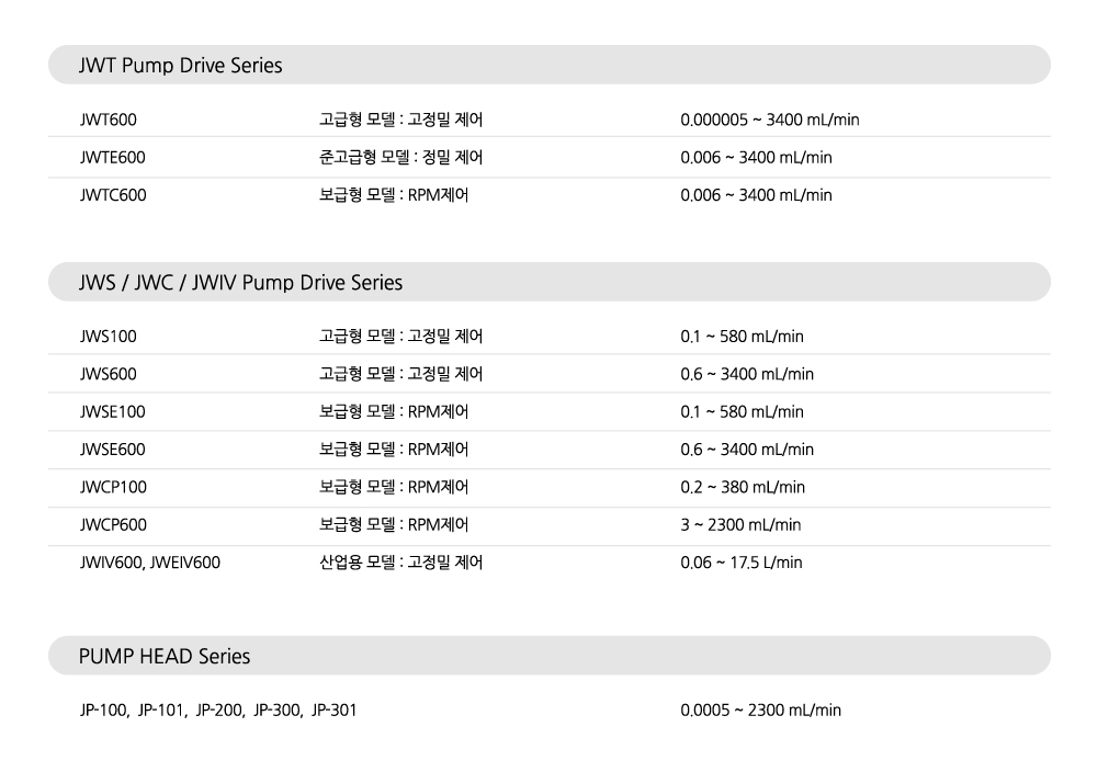 사용 목적에 맞게 JWT / JWS / JWC / JWIV Pump Drive Series로