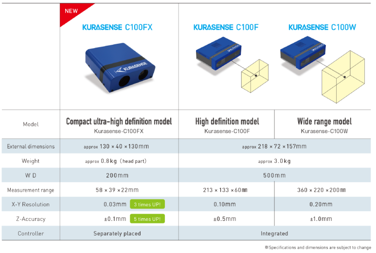 | ✔️ KURASENSE Series 의 특징 · Flexible objects 의 미세한 움직임을 정확히 인식 · 매우 얇은 대상 (0.1mm)까지 인식 · Object 의 색상 인식 가능 · 적은 양의 데이터 획득으로 고속 처리 가능 · 백라이트 설정 가능 · 3D CAD model matching 이 필요 없음 |