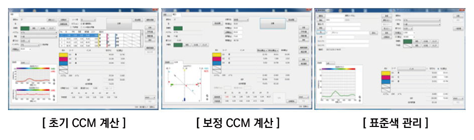 | 🟠 초기 CCM 계산 🟣 보정된 CCM 계산 🔵 표준색 관리 🟠 근사색 검색 🟣 기본 데이터 관리 🔵 색채 관리 |