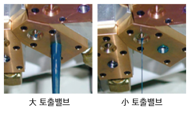 이중 배럴 배출 밸브가 사용되며 최적의 배출을 위해 분배되는 잉크의 양에 따라 밸브 크기가 달라집니다. |